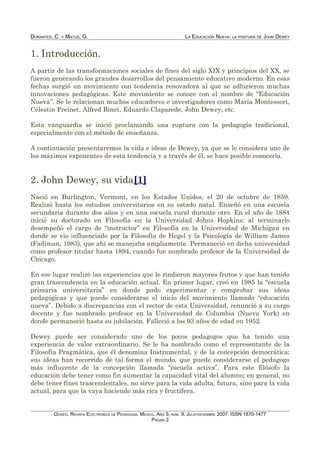 Este documento resume las principales ideas de John Dewey sobre la educación nueva. En particular, analiza tres elementos clave: 1) La relación entre el niño y la escuela, señalando que la escuela tradicional fragmenta la experiencia del niño; 2) Que las materias de enseñanza deben estar ancladas en la vida diaria del niño; 3) Que la escuela debe ser una mini comunidad que recrea la vida en sociedad. El documento utiliza las ideas de Dewey para defender una educación activa y centrada en el niño.