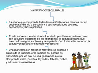 El documento resume las principales manifestaciones culturales de Venezuela, incluyendo la tradición oral, ritos y creencias, artesanías, textiles, gastronomía, paisajes naturales, efectos socioculturales de la migración, religión predominante, sistema político federal descentralizado y características del idioma español hablado en Venezuela con algunos términos del vocabulario venezolano.