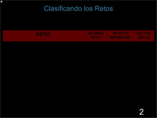 El documento presenta 5 retos principales para mejorar la calidad de la educación y promover la innovación educativa en Colombia. Estos incluyen ofrecer programas que preparan a los estudiantes para la práctica profesional, crear un currículo basado en competencias centrado en los estudiantes, mejorar la competencia de la facultad en estrategias innovadoras de enseñanza, motivar a los estudiantes para un aprendizaje de por vida, y colaborar con profesionales y partes interesadas clave.