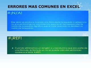 Este documento resume los errores más comunes en Excel, incluyendo el error #¡NOMBRE! que ocurre cuando una fórmula no está bien escrita o no existe, el error #¡VALOR! que ocurre cuando se usan tipos de datos distintos en un cálculo, y el error #¡DIV/0! que ocurre cuando se divide por cero. También describe el error #¡NULO! que ocurre al relacionar celdas o rangos que no se intersectan y el error de ancho de columna cuando un valor es más grande que el ancho de la columna.