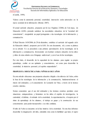 Este documento presenta una propuesta didáctica que combina las TIC (tecnologías de la información y comunicación) y la sinéctica como estrategia didáctica para favorecer el primer contacto de niños de educación infantil con el lenguaje audiovisual y desarrollar su creatividad. La propuesta se centra en la biografía de Leonardo da Vinci y la vida de los alumnos utilizando el rincón del ordenador y técnicas creativas como la sinéctica.