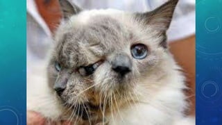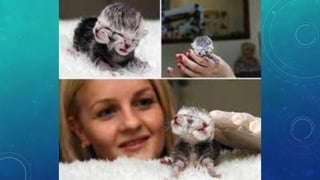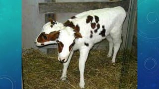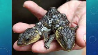 El documento trata sobre la policefalia, una mutación que resulta de una alteración en la secuencia del ADN. Se mencionan casos representativos de esta condición en gatos, como el de Frank y Louie, y en serpientes, como We. La policefalia es más común en gatos y serpientes.