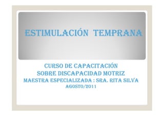 Este documento presenta información sobre un curso de capacitación sobre estimulación temprana para niños con discapacidad motriz. Explica que la estimulación temprana es una atención integral dirigida al niño y su familia durante los primeros seis años de vida para promover un desarrollo armónico. También describe los fundamentos de la estimulación temprana, incluyendo la importancia de la estimulación y la experiencia durante los primeros dos años de vida, así como los criterios organizativos y el equipo de tratamiento integral requerido.