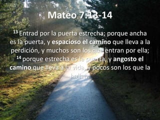 El documento contrasta dos maneras de vivir: el camino ancho que conduce a la perdición y el camino angosto que conduce a la vida. El camino ancho se caracteriza por seguir los deseos del diablo y centrarse solo en cosas terrenales. El camino angosto implica obedecer los mandamientos de Dios, amar a los demás y vivir de forma diferente al mundo, buscando siempre la gloria de Dios.