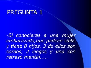 Este documento presenta dos preguntas. La primera pregunta si se le recomendaría a una mujer embarazada con sífilis y ocho hijos (tres sordos, dos ciegos y uno con retraso mental) practicarse un aborto. La segunda pregunta pide elegir entre tres candidatos para líder mundial, pero revela que los candidatos son Franklin D. Roosevelt, Winston Churchill y Adolfo Hitler, respectivamente. El documento enfatiza la importancia de pensar detenidamente antes de juzgar a otros.