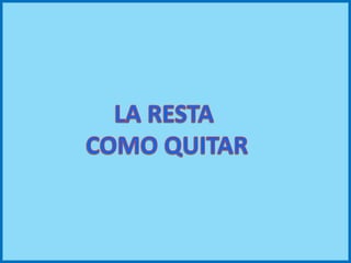 El documento aborda el enfoque pedagógico de la resta en los primeros cursos de primaria, enfatizando la importancia de visualizar y manipular problemas relacionados con 'quitar' y 'cuánto le falta'. Se sugiere el uso de dramatización y presentación de problemas de manera interactiva para facilitar la comprensión de los conceptos. Asimismo, se destaca la necesidad de enseñar a los estudiantes cómo identificar y resolver problemas matemáticos mediante la acción de restar.