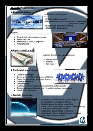 Marbella Comunicación y Ferias S.L. es una agencia de comunicación, publicidad y marketing que ofrece servicios como desarrollo de planes de comunicación, producción audiovisual, diseño gráfico, y gestión de eventos. La agencia cuenta con un equipo de profesionales experimentados y ha trabajado con numerosas instituciones y empresas.