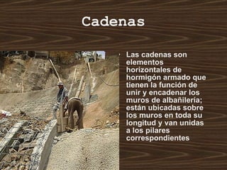 El documento proporciona dosificaciones recomendadas para varios materiales de construcción como cadenas, emplantillado, estuco exterior y cimientos. Las cadenas son elementos horizontales de hormigón armado que unen los muros. El emplantillado es una capa de hormigón de bajo contenido de cemento que aísla las armaduras del suelo. El estuco proporciona una terminación lisa a los muros y ayuda a impermeabilizarlos. Los cimientos transmiten las cargas de la edificación al suelo.