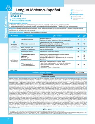 Este documento presenta un plan de estudios para el primer grado de primaria en español. Incluye actividades puntuales y recurrentes divididas en bloques temáticos. La primera parte se enfoca en familiarizar a los estudiantes con la escuela y el entorno, reconocer la escritura de nombres propios y diferenciar letras de números. La segunda parte introduce ejercicios de identificar palabras que comienzan con la misma letra y lectura compartida de cuentos. El objetivo general es que los estudiantes descubran las relaciones entre lo que escuchan y