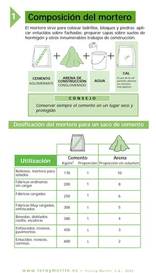 Este documento proporciona información sobre la dosificación y preparación de mortero y hormigón. Explica cómo dosificar el cemento, la arena y el agua para producir mortero y hormigón de diferentes resistencias y aplicaciones. También describe cómo preparar el mortero y hormigón manualmente o usando una hormigonera, y menciona el uso de aditivos y morteros/hormigones predosificados.