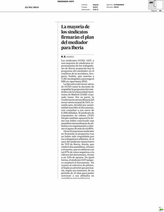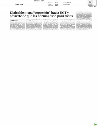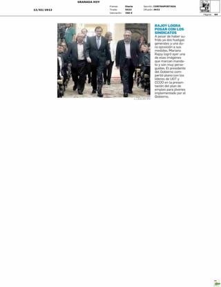 El documento resume varias noticias de periódicos locales de Granada del 13 de marzo de 2013, incluyendo que el primer ministro Rajoy anunció un plan para crear empleos para jóvenes, que la mayoría de sindicatos firmarán un acuerdo para Iberia, y que el director de RTVA renunció sorpresivamente perjudicando al gobierno regional.