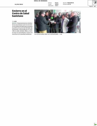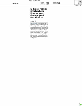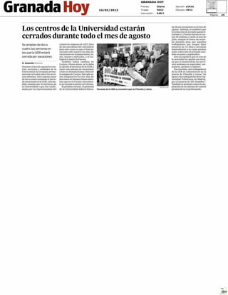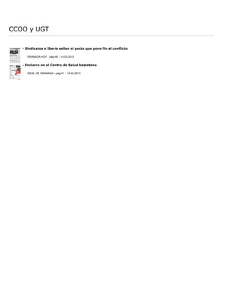 El documento resume varias noticias de periódicos locales de Granada, España del 14 de marzo de 2013. Incluye artículos sobre sindicatos como CCOO y UGT sellando un acuerdo que pone fin a un conflicto con Iberia, bomberos pidiendo ayuda de vecinos para no tener que ir escoltados a una zona del norte, y los centros de la Universidad estarán cerrados durante todo el mes de agosto.