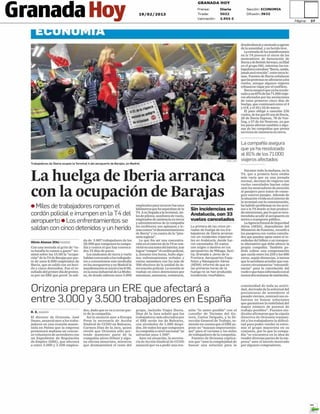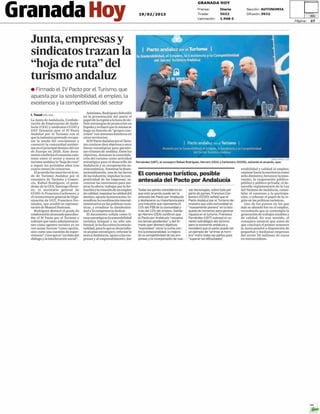 El documento resume varias noticias de periódicos locales de Granada del 19 de febrero de 2013. Incluye noticias sobre una reunión entre sindicatos y el gobierno andaluz para trazar una estrategia de turismo, los efectos de una huelga de Iberia que afectó a más de 900 pasajeros, y los esfuerzos continúos de sindicatos como CCOO y UGT para luchar contra la brecha salarial de género y otros temas laborales y sindicales.