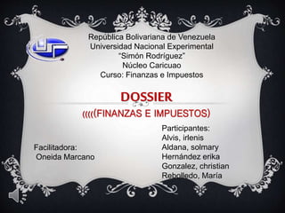 Este documento resume conceptos clave sobre finanzas e impuestos. Define finanzas, finanzas públicas, ingresos públicos, impuestos, tasas, contribuciones especiales y gasto público. También explica la administración de las finanzas empresariales, el financiamiento básico y las fuentes de financiamiento. El documento fue escrito para un curso sobre finanzas e impuestos en la Universidad Nacional Experimental Simón Rodríguez en Venezuela.