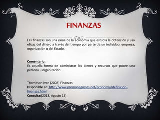 Este documento presenta definiciones y comentarios sobre varios temas relacionados con las finanzas e impuestos. Explica conceptos clave como finanzas, finanzas públicas, ingresos públicos, impuestos, tasas, contribuciones especiales, gasto público, administración de finanzas empresariales, financiamiento básico y fuentes de financiamiento. El documento parece ser material de estudio para un curso sobre este tema.