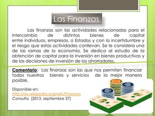 Los documentos tratan sobre diferentes temas relacionados con las finanzas públicas y privadas. Abordan conceptos como las finanzas, las finanzas públicas, los ingresos públicos, impuestos, tasas, contribuciones especiales, gasto público, administración de finanzas empresariales, fuentes de financiamiento y responsabilidad social.