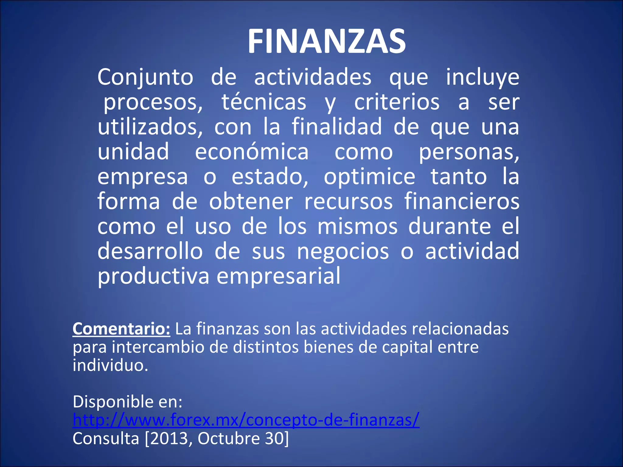 Las finanzas son el conjunto de actividades relacionadas con la obtención y uso de recursos financieros. Incluyen procesos como determinar fuentes de financiamiento, gestionar ingresos (impuestos, tasas) y gastos públicos. El objetivo es que las entidades económicas (personas, empresas, estados) optimicen de manera sostenible la forma de conseguir y emplear fondos para sus operaciones y proyectos.