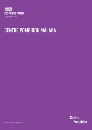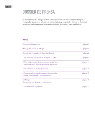 Este documento presenta el Centre Pompidou Málaga, un centro temporal del Museo Nacional de Arte Moderno Centre Pompidou en Málaga, España. Incluye una selección de 90 obras de la colección del Centre Pompidou y exposiciones temporales. La exposición permanente explora temas como las metamorfosis, el cuerpo fragmentado, autorretratos y más, mostrando la evolución del arte desde Picasso hasta artistas contemporáneos. El Centre Pompidou Málaga ofrece una experiencia cultural única que combina arte, programación interdisciplin