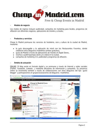 El blog Cheap In Madrid proporciona información sobre restaurantes, ocio y cultura a bajo coste en Madrid. Fue creado en 2010 por Sarah Serakalala y ofrece guías, aplicaciones móviles y reseñas de locales. Genera ingresos a través de publicidad y campañas de marketing para negocios. El equipo está formado por 8 redactores de diferentes nacionalidades que escriben en inglés y español.
