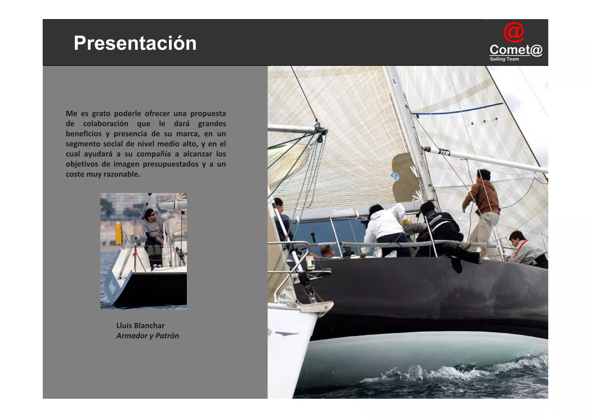 El documento presenta una propuesta de colaboración entre un equipo de regatas y una empresa. El equipo ha tenido éxito en competiciones regionales y nacionales. Ahora cambian a un barco más competitivo y buscan patrocinio de una empresa para mejorar su rendimiento y aumentar la visibilidad de la marca del patrocinador a través de publicidad en el barco, equipación, y medios sobre las regatas. Se ofrecen varias opciones de patrocinio con diferentes niveles de visibilidad y coste.
