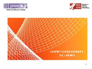 Este documento proporciona información sobre la segunda Feria de Empleo Juvenil que se llevará a cabo en Bilbao los días 22 y 23 de noviembre de 2010. La feria tiene como objetivo conectar a jóvenes con empresas, centros de formación y organismos públicos para orientar su desarrollo profesional. Incluirá expositores, talleres, conferencias y entrevistas de trabajo. Se dividirá en secciones sobre inserción laboral, formación, emprendimiento e innovación.