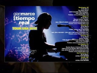 GianMarco anuncia una gira por 7 ciudades de Estados Unidos e incluye detalles sobre su biografía y discografía. Nació en Lima, Perú en 1970 hijo de los artistas Regina Alcóver y Joe Danova. Comenzó a cantar desde una edad temprana y ha tenido una exitosa carrera como cantante en Perú y a nivel internacional.