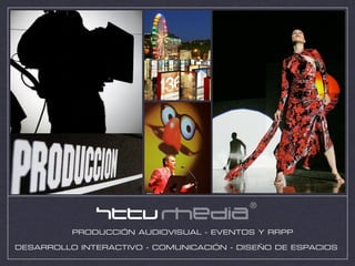 HTTV Media es una empresa de comunicación que ofrece servicios de producción audiovisual, organización de eventos, desarrollo interactivo, comunicación y diseño de espacios. La empresa cuenta con profesionales expertos en estas áreas y produce proyectos como videos publicitarios, corporativos y para cine, organización de festivales, ferias y eventos, desarrollo de páginas web y material interactivo, campañas de comunicación y diseño de exposiciones y stands.