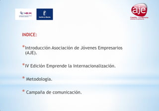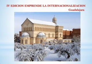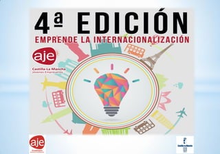 Este documento describe la IV edición del evento "Emprende la Internacionalización" organizado por la Asociación de Jóvenes Empresarios de Castilla-La Mancha. El evento se llevará a cabo el 20 de marzo en Guadalajara y consistirá en una mesa coloquio sobre oportunidades de negocio en Perú, un taller sobre la expansión a nuevos mercados, la entrega de un premio a un joven empresario internacional y un panel con experiencias empresariales en mercados emergentes. El objetivo es capacitar a los