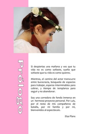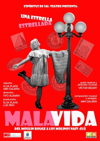 El documento describe la obra de teatro "Malavida", una sátira sobre el género de cabaret. Se centra en el personaje de Malavida, una actriz que vive en su imaginación y recuerda sus supuestas aventuras en famosos cabarets de París, Buenos Aires, Nueva York y La Habana. El vestuario y la escenografía reflejan la realidad distorsionada en la mente de Malavida. La música acompaña sus recuerdos de diferentes épocas.