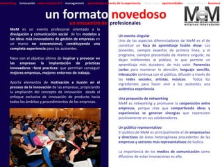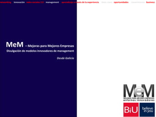 El documento describe MeM, un evento profesional en Galicia que tiene como objetivo divulgar modelos innovadores de gestión de empresas. La primera edición tuvo lugar en 2010 en Vigo y contó con la participación de expertos. En 2011 se celebró la segunda edición en la Fundación Barrié de la Maza con el objetivo de inspirar la implantación de mejores prácticas en las empresas. MeM pretende expandirse a otras ciudades españolas y países americanos para promover la innovación y mejorar los entornos laborales.