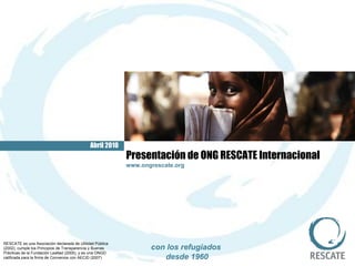Rescate Internacional es una ONG española fundada en 1960 que trabaja con refugiados y desplazados, enfocándose en niños y mujeres, y desarrolla proyectos de acción social, cooperación internacional y sensibilización. En 2008, benefició a más de 650,000 personas en 11 países y es reconocida por su transparencia y buenas prácticas. La organización busca colaboraciones económicas y de voluntariado para sostener sus programas.