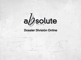 La división online de Grupo Abbsolute ofrece soluciones efectivas de marketing, comunicación y desarrollo de proyectos online para satisfacer las necesidades de los clientes. El equipo cuenta con experiencia en proyectos web y nuevas tecnologías, incluyendo certificaciones de Google. La división provee servicios como análisis de mercado, estrategias en redes sociales, posicionamiento en buscadores y métricas web.