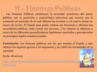 Las finanzas se pueden definir como el conjunto de actividades relacionadas con el dinero, la banca y la bolsa de un negocio. Las finanzas públicas constituyen la actividad económica del sector público y obtienen recursos a través de impuestos para cubrir las necesidades de la sociedad. Los ingresos públicos incluyen impuestos y se clasifican en ordinarios e extraordinarios para realizar análisis económicos.