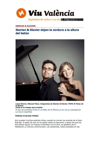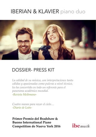 Iberian & Klavier es un destacado dúo de piano formado por Laura Sierra y Manuel Tévar. Han ganado varios premios internacionales y se han presentado en importantes salas de conciertos en Europa, Asia, América y España. Sus interpretaciones se caracterizan por su calidad técnica, pasión y habilidad para transmitir emociones a través de la música.