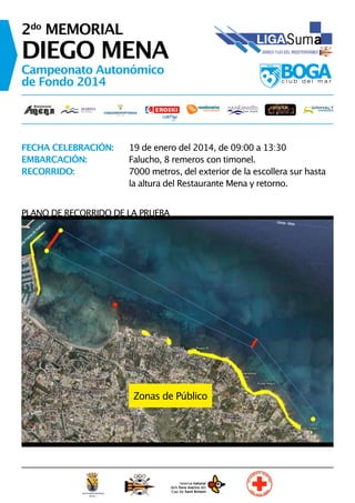 Este documento proporciona información sobre el 2do Memorial Diego Mena, un campeonato autonómico de fondo que se celebrará el 19 de enero de 2014 en Denia, España. La regata consta de varias mangas en faluchos de 8 remeros y un timonel a lo largo de un recorrido de 7000 metros. Se proporcionan detalles sobre el horario, la ubicación, las instalaciones de apoyo y los servicios disponibles para los espectadores y participantes.