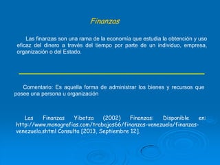 Este documento contiene definiciones y explicaciones sobre varios temas relacionados con las finanzas. Explica conceptos como finanzas públicas, privadas, ingresos públicos, impuestos, tasas, contribuciones especiales, gastos públicos, administración de finanzas empresariales, financiamiento básico, fuentes de financiamiento empresarial y responsabilidad social. Cada sección presenta una definición seguida de un comentario adicional.