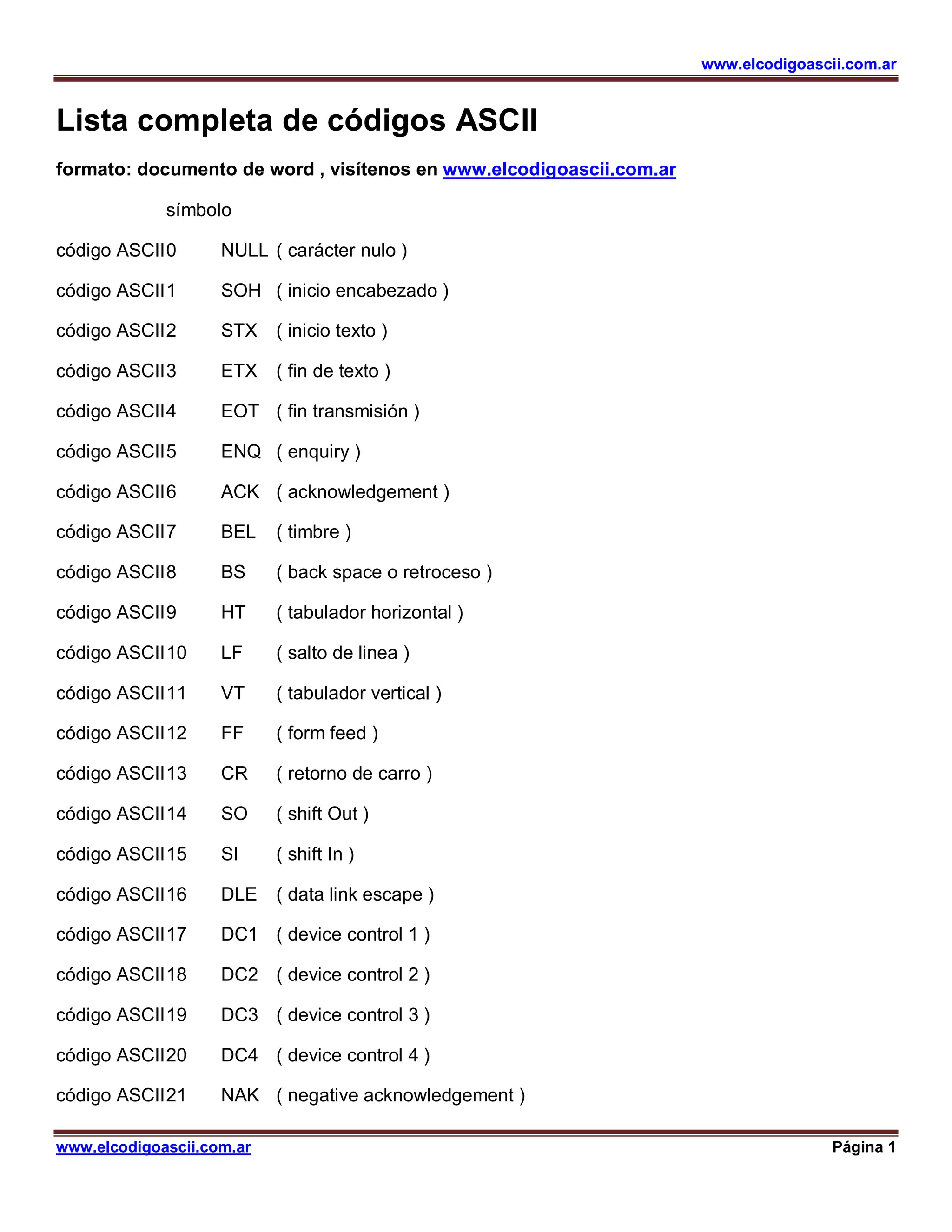 Este documento proporciona una lista completa de los códigos ASCII de 0 a 255. Describe cada código numérico y su símbolo correspondiente, incluyendo letras mayúsculas y minúsculas, números, signos de puntuación y otros caracteres especiales. La lista está organizada en páginas sucesivas debido a su longitud y proporciona información sobre el formato del documento y la dirección web para obtener más detalles.
