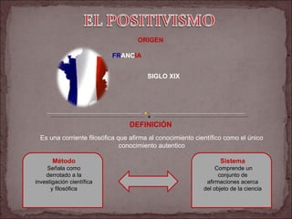 El documento describe el positivismo, una corriente filosófica que afirma al conocimiento científico como el único conocimiento auténtico. Se originó en Francia en el siglo XIX y fue fundado por Augusto Comte y John Stuart Mill. Existen dos variantes, el positivismo extremo que utiliza mucho el empirismo y rechaza los juicios de valor, y el positivismo atenuado que considera al conocimiento también útil para el mundo social.