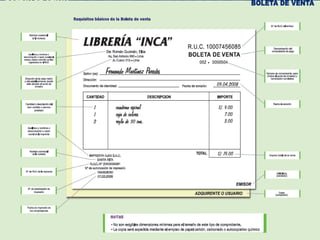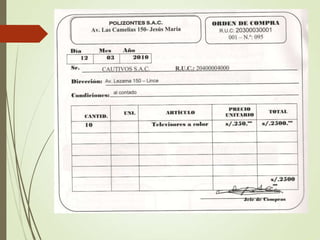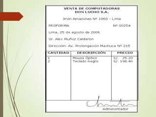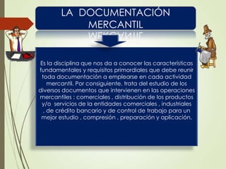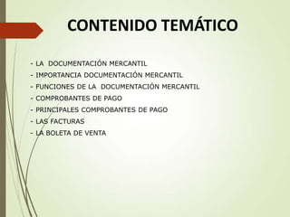 Este documento describe la importancia de la documentación mercantil y los principales tipos de documentos utilizados. Explica que la documentación mercantil permite validar transacciones comerciales y registrar operaciones para fines contables y tributarios. Luego detalla los comprobantes de pago más comunes como facturas y boletas de venta, sus funciones y cuando deben ser utilizados. Finalmente, brinda detalles sobre cómo completar facturas y boletas de venta correctamente.