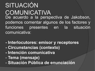 El documento analiza la situación comunicativa a través de la perspectiva de Jakobson, abordando elementos como emisor, receptor, circunstancias, intención comunicativa, tema y la naturaleza pública de los discursos. Se exploran ejemplos históricos como el discurso de Salvador Allende y se discute la estructura de los discursos públicos, incluyendo la introducción, desarrollo y conclusión. También se examinan distintos tipos de discursos públicos, desde políticos hasta ceremoniales, y se resalta la importancia de factores contextuales y temáticos en la comunicación efectiva.