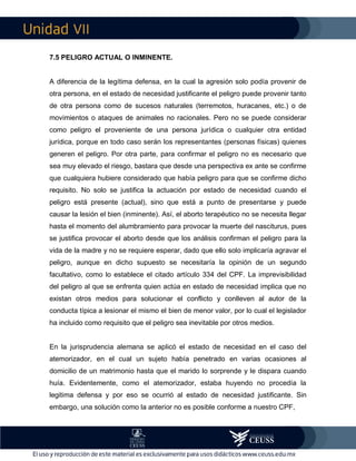Este documento discute el concepto de peligro actual o inminente en el contexto de la justificación por estado de necesidad. Explica que el peligro puede provenir de personas, sucesos naturales o animales, pero no de entidades jurídicas. Además, el peligro no necesita ser muy elevado, solo debe considerarse como tal desde una perspectiva prospectiva. También analiza casos jurisprudenciales en los que se ha aplicado con éxito o no el estado de necesidad.