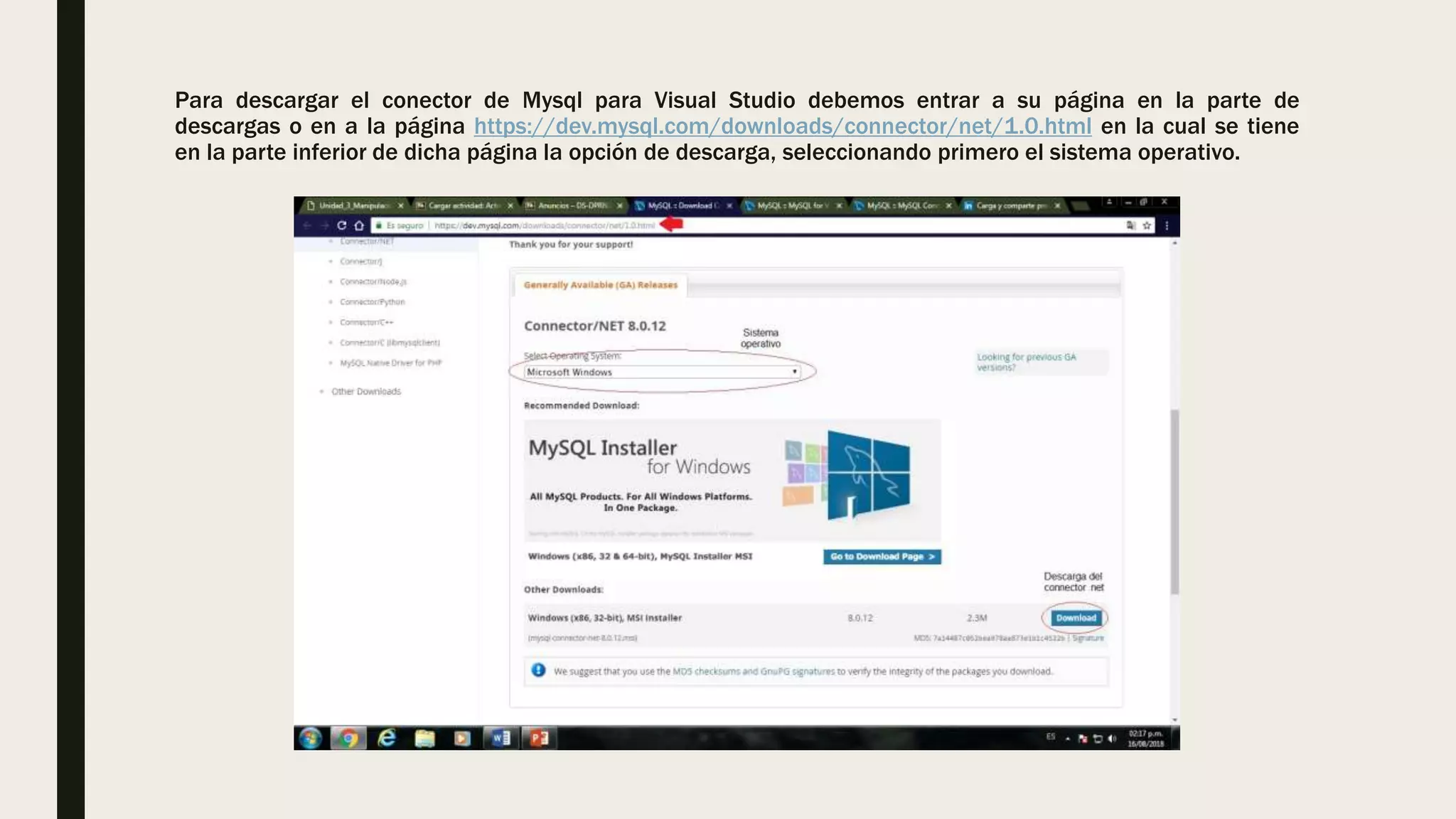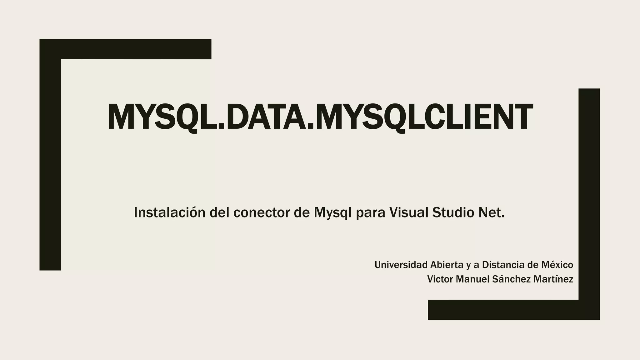 El documento explica cómo instalar el conector de MySQL para Visual Studio .NET. Describe que se debe descargar el archivo de instalación desde la página web de MySQL y ejecutarlo siguiendo las instrucciones predeterminadas. Una vez instalado, el conector estará disponible en Visual Studio para conectarse a bases de datos MySQL. También resume las principales clases del espacio de nombres MySql.Data.MySqlClient que permiten realizar operaciones como consultas, actualizaciones y lecturas en las bases de datos.
