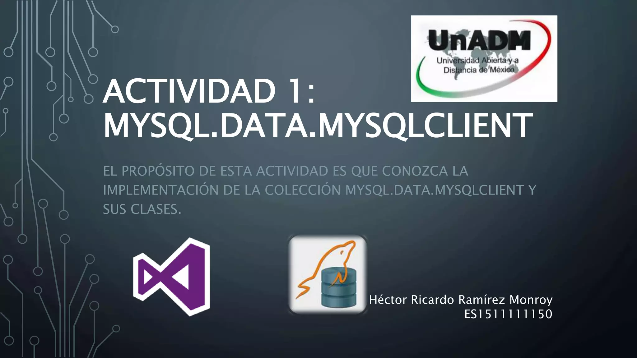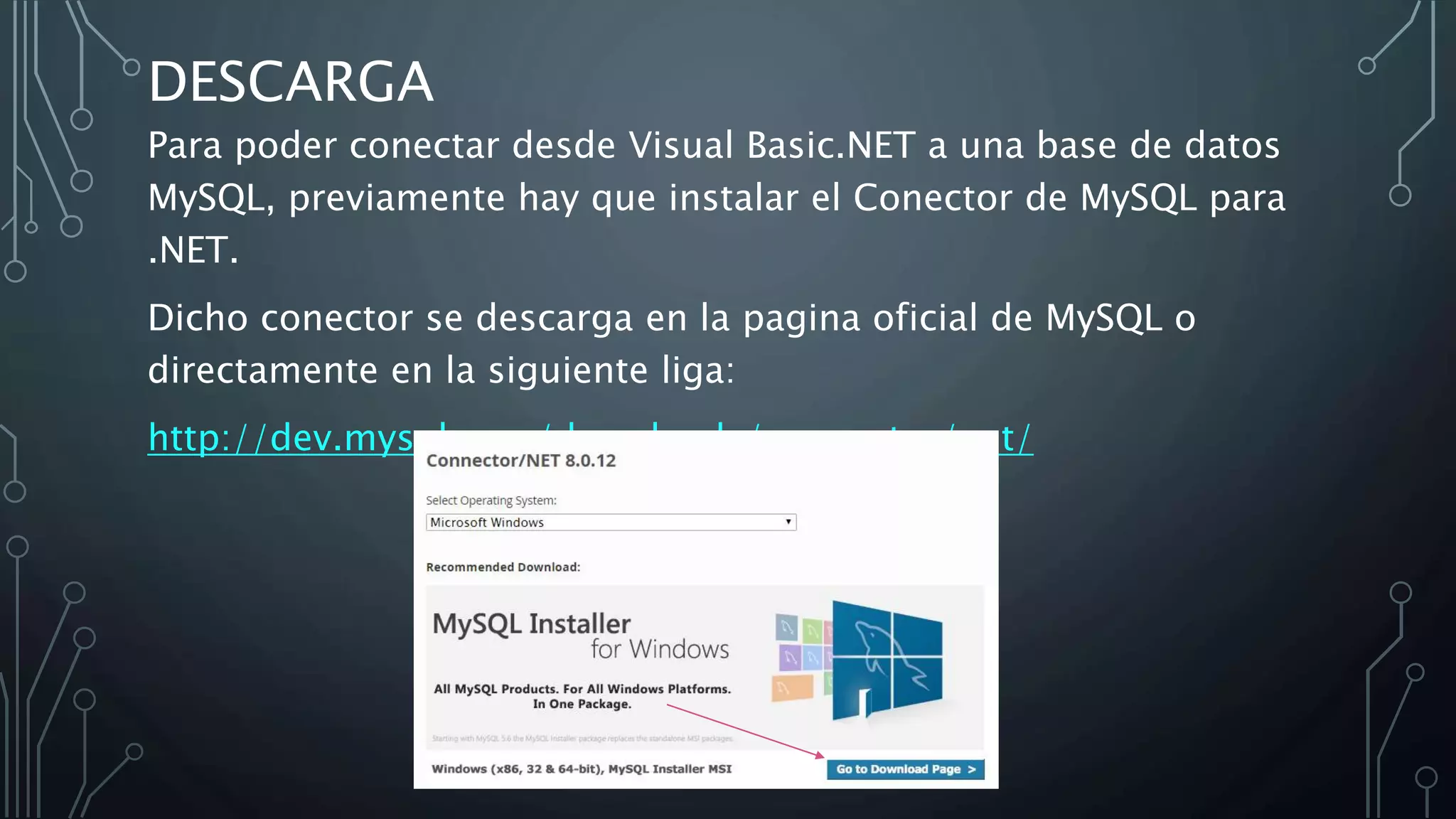 El documento detalla cómo conectar una aplicación de Visual Basic .NET a una base de datos MySQL utilizando el conector MySQL para .NET. Describe la instalación del conector, la adición de la referencia en el proyecto y proporciona un ejemplo de cadena de conexión. Además, menciona las principales clases del MySQLClient, como MySqlConnection, MySqlDataAdapter, y MySqlDataReader.