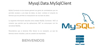 MySQL Connector es una gama de controladores que permiten acceder y manipular una base de datos. El documento describe cómo instalar MySQL Connector/NET, el conector que permite que las aplicaciones .NET se comuniquen con servidores MySQL. El proceso de instalación incluye buscar, descargar, extraer, instalar y aplicar el conector.