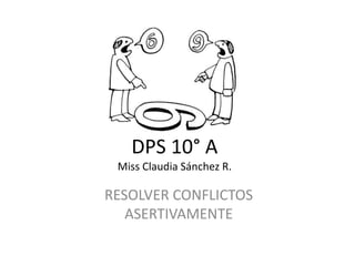 El documento proporciona instrucciones para resolver conflictos de manera asertiva, incluyendo describir hechos concretos, manifestar sentimientos y pensamientos, pedir cambios de conducta específicos, y especificar consecuencias positivas. También presenta cuatro ejemplos de situaciones interpersonales conflictivas y sugiere cómo responder de manera pasiva, agresiva o asertiva en cada caso.