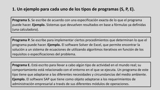 Este documento presenta información sobre el mantenimiento de sistemas de software. Explica tres tipos de programas (S, P, E), las tres etapas de evolución del software (alfa, madurez, salida), y proporciona ejemplos de cada uno. También describe cuatro tipos de cambios (mejora de funciones, mejora de interfaz, especificación incorrecta, especificación de requisitos incorrecta) e incluye un ejemplo para cada tipo. Por último, presenta conclusiones sobre la importancia del mantenimiento de software.