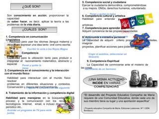 Este documento describe las 9 competencias básicas que los estudiantes deben desarrollar. Estas competencias incluyen la comunicación, matemáticas, interacción con el mundo físico, tratamiento de la información, social y ciudadana, cultural y artística, aprender a aprender, autonomía e iniciativa personal, y espiritual. El documento también señala que una sola actividad puede desarrollar múltiples competencias.