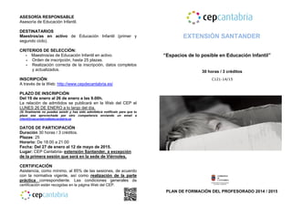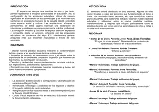 Este documento presenta un seminario de 30 horas sobre los espacios en la educación infantil. El seminario explorará cómo la configuración de los ambientes educativos influye en el aprendizaje y las relaciones sociales. A lo largo de diez sesiones, ponentes expertos compartirán ideas sobre temas como la importancia de los espacios en Reggio Emilia, el arte y la educación, y la documentación pedagógica. El seminario busca mejorar la práctica docente mediante la reflexión sobre los espacios y ambientes educativos.
