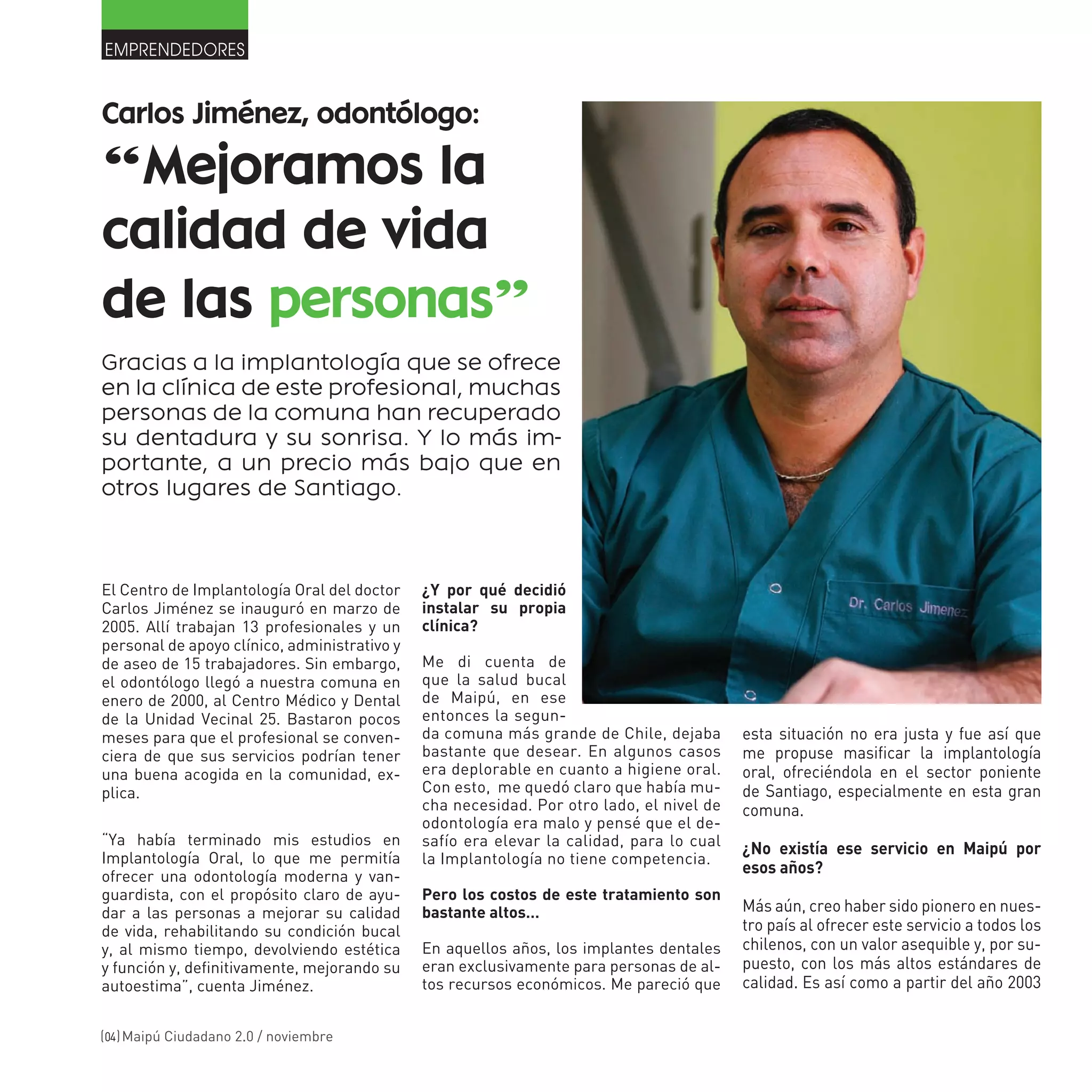 Carlos Jiménez es un odontólogo que inauguró su Centro de Implantología Oral en 2005 en Maipú para ofrecer tratamientos de implantología oral a precios accesibles y mejorar la calidad de vida de las personas a través de la recuperación de su dentadura y sonrisa. La clínica ofrece una variedad de servicios odontológicos de vanguardia y ha tenido un crecimiento constante a lo largo de los años. Jiménez señala que no ve a otros odontólogos como competencia sino como colaboradores
