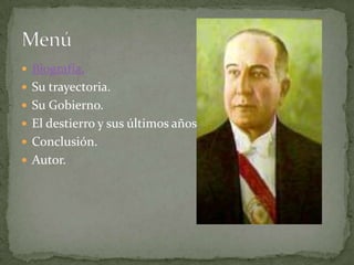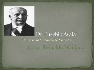 El documento presenta una biografía del político y presidente paraguayo Eusebio Ayala. Detalla su nacimiento, educación, carrera política como ministro y legislador, su primer periodo como presidente provisional entre 1921-1923, su segundo gobierno constitucional entre 1932-1936 cuando fue derrocado, y sus últimos años en el exilio en Buenos Aires hasta su muerte en 1942.